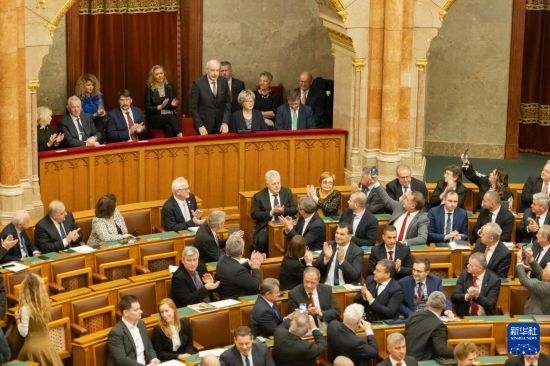 2月26日,在匈牙利布達佩斯,匈牙利當(dāng)選總統(tǒng)舒尤克·道馬什(前中)接受祝賀。新華社發(fā)(弗爾季·奧蒂洛攝)