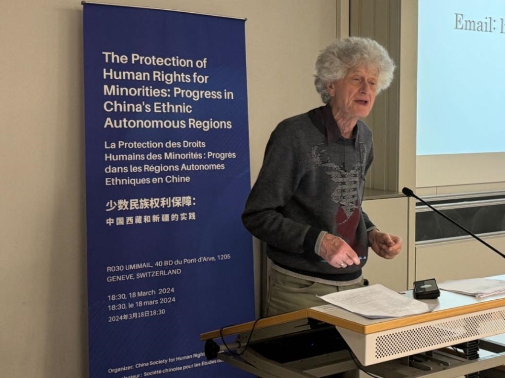 ?3月18日,由中國(guó)人權(quán)研究會(huì)主辦的“少數(shù)民族權(quán)利保障:中國(guó)西藏和新疆實(shí)踐”主題講座在瑞士日內(nèi)瓦舉行。圖為比利時(shí)知名藏學(xué)家安德烈·拉克魯瓦在講座上發(fā)言。新華社記者石松攝