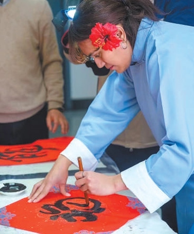 安雅在學(xué)校為留學(xué)生舉辦的新春活動上用毛筆書寫“?!弊?。受訪者供圖