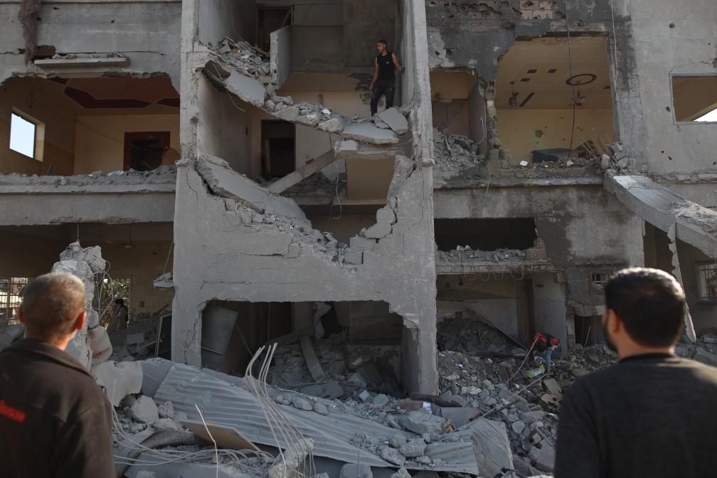 ?4月2日,在加沙地帶中部城市代爾拜拉赫,人們查看被以軍空襲后的建筑。新華社發(fā)