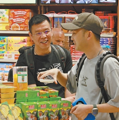 在泰國曼谷素萬那普機(jī)場免稅店,兩名中國游客正在購買當(dāng)?shù)靥厣a(chǎn)品。