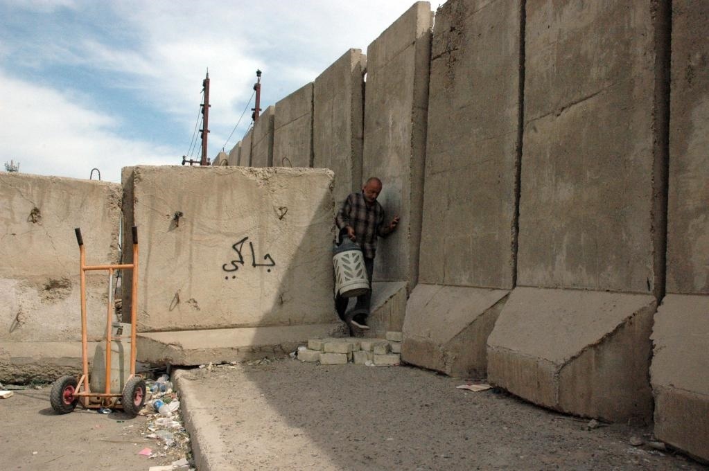 ?2013年3月20日,在伊拉克首都巴格達,一名伊拉克人從防爆墻的縫隙之間穿過。新華社發(fā)(巴沙爾攝)