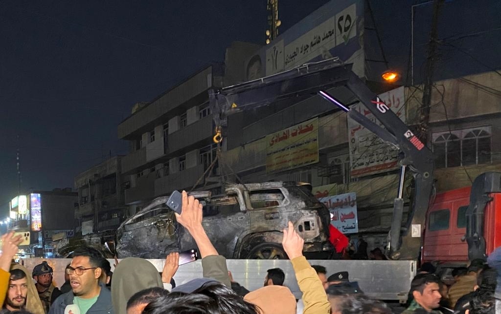 ?2024年2月7日,在伊拉克首都巴格達,民防部門轉(zhuǎn)移遭無人機襲擊的車輛。新華社發(fā)(哈利勒·達伍德攝)