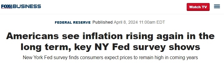 ??怂股虡I(yè)頻道在其另一篇報道中提到,據(jù)8日公布的一項紐約聯(lián)邦儲備銀行(Federal Reserve Bank of New York)進行的消費者預(yù)期調(diào)查顯示,美國人正在為未來幾年的高通脹率做準備,公眾普遍的預(yù)期中值為從現(xiàn)在起一年內(nèi)通脹率將上升3%,與前幾個月持平,并在未來幾年通脹將保持高位,這表明他們認為粘性通脹恐會持續(xù)下去。