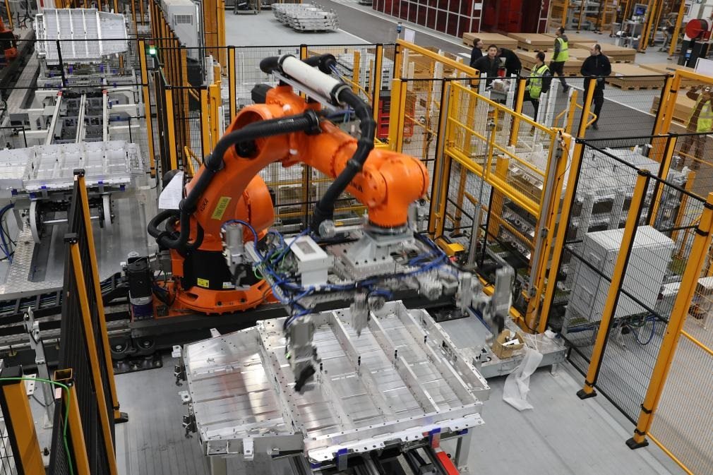 2月23日,在法國呂茨,搬運(yùn)機(jī)器人在中國敏實(shí)集團(tuán)與法國雷諾集團(tuán)成立的合資公司的電池盒產(chǎn)線上工作。新華社記者張百慧攝