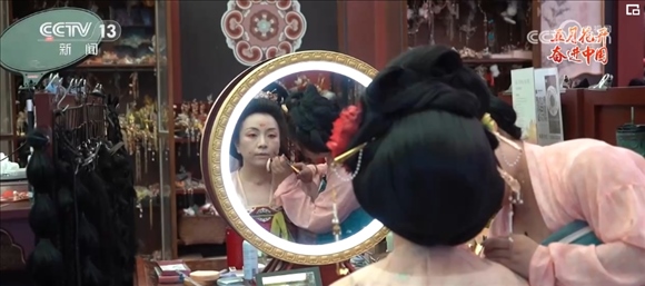 一抹柳葉眉,一頭貴妃髻,在胡芯銀的巧手之下,不到40分鐘的時間,一個“楊貴妃”的妝造就完成了,胡芯銀還專門在發(fā)髻上加上了古代飾物“步搖”。