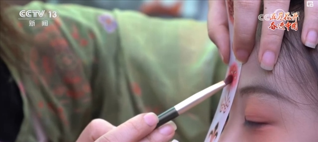 花鈿是古代女性在額頭部位點(diǎn)綴的一種花飾?,F(xiàn)在的胡芯銀,不僅會根據(jù)顧客的年齡、臉型和服裝的樣式來搭配不同風(fēng)格的花鈿,還會給小姐姐們做一些傳統(tǒng)文化的講解。胡芯銀說,要想做得更好,就要多看多學(xué)。