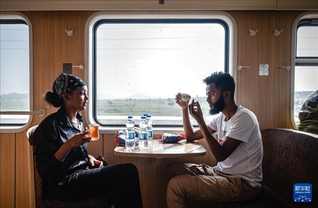 2023年9月9日,乘客在亞吉鐵路列車的餐車內交談。新華社記者 王冠森 攝
