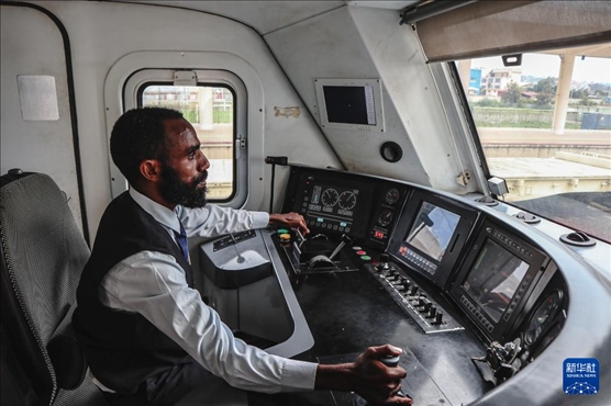 ?2024年5月10日,埃塞俄比亞火車司機在亞吉鐵路列車的駕駛室里工作。新華社記者 劉方強 攝
