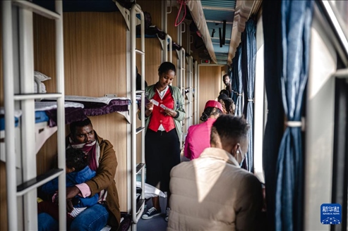 2023年9月9日,列車員在亞吉鐵路列車的車廂內查票。新華社記者 王冠森 攝
