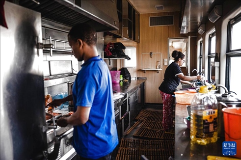 2023年9月9日,工作人員在亞吉鐵路列車上準備餐食。新華社記者 王冠森 攝