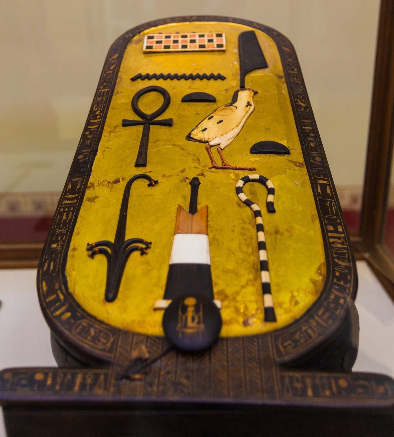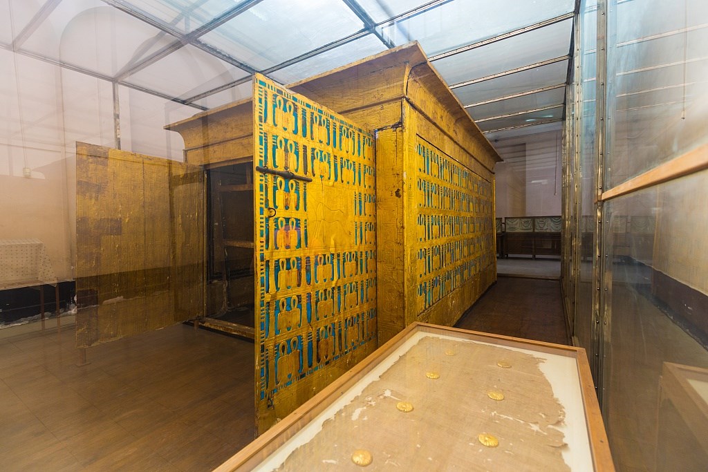 埃及博物館里陳列的圖坦卡蒙法老石棺最外層貼金橡木棺槨
