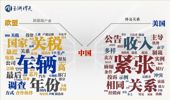 可以看到,以“車輛”“部門”“公司”“制造”等詞為代表的關(guān)鍵詞,都指向了新能源行業(yè)。相比之下,美國媒體對同一話題的討論,更側(cè)重“緊張”“關(guān)系”“沖突”“政治”等指向外交關(guān)系的關(guān)鍵詞。