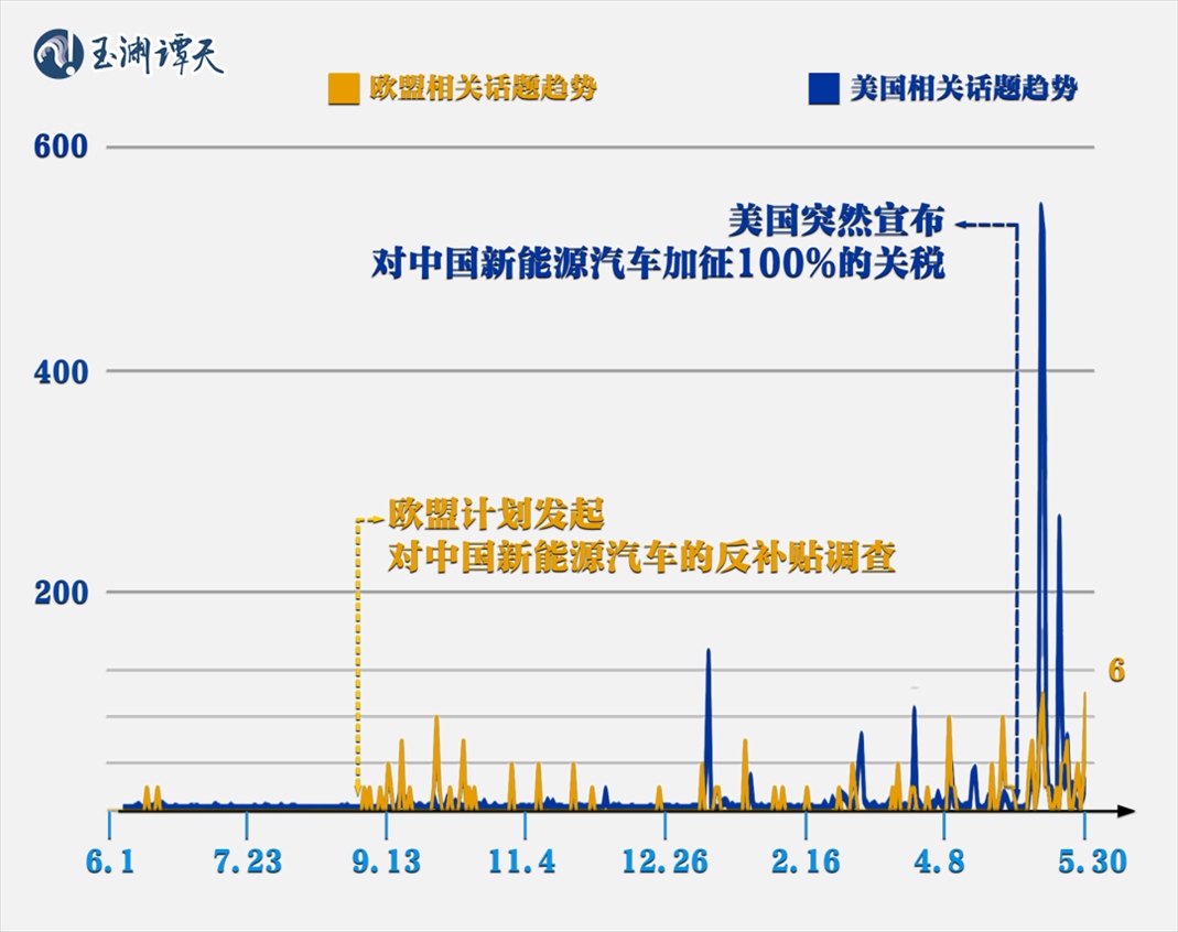 譚主分地區(qū)集納了過去一年外媒關(guān)于“對中國新能源汽車加征關(guān)稅”的報(bào)道,發(fā)現(xiàn)美國和歐洲地區(qū)出現(xiàn)了明顯的錯峰: