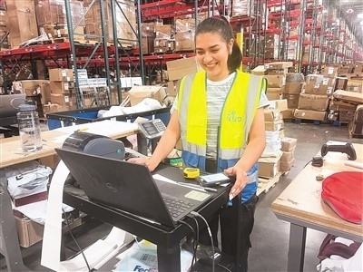 在位于美國新澤西的海外倉內(nèi),杰西卡·卡斯蒂羅正在電腦前工作。孫伊豆攝