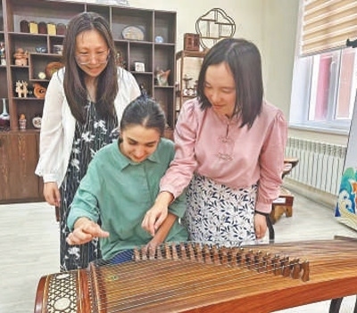 聯(lián)合采訪團(tuán)隊(duì)塔方記者在孔子學(xué)院體驗(yàn)古箏。本報(bào)記者 顏 歡攝