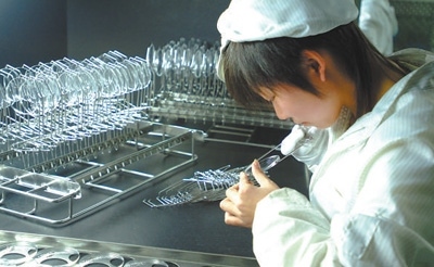 在江蘇丹陽(yáng)市一家光學(xué)眼鏡有限公司,工作人員在鍍膜車(chē)間內(nèi)檢查、填裝鏡片。新華社記者 李 博攝