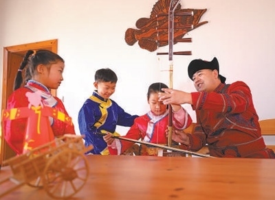 哈拉新村村民在教當(dāng)?shù)睾⒆友葑鄠鹘y(tǒng)樂器。齊齊哈爾大學(xué)孟加拉國籍留學(xué)生 衣睿實攝“在哈拉新村,我看到四弦琴造型的村口大門、魚叉狀的路燈,還有整整齊齊的‘介字房’……這里獨特的民族文化、濃郁的鄉(xiāng)土風(fēng)情,給我留下了深刻印象。當(dāng)?shù)丶缺A魝鹘y(tǒng)的達(dá)斡爾族人文特征,又開發(fā)文化體驗館、民族特色美食等現(xiàn)代旅游資源,重視文化保護(hù)和傳承的做法值得借鑒?!?/p>