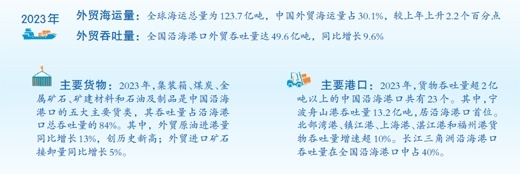 在全球范圍內(nèi),超八成的國際貿(mào)易通過海上運(yùn)輸實(shí)現(xiàn),海運(yùn)是中國外貿(mào)的“大動脈”?!吨袊劭谶\(yùn)行分析報(bào)告(2024)》(以下簡稱《報(bào)告》)顯示,2023年,在外貿(mào)需求回暖、全球貿(mào)易體系重塑等因素推動下,中國外貿(mào)海運(yùn)規(guī)模增長較快,全國沿海港口外貿(mào)吞吐量達(dá)49.6億噸,同比增長9.6%。