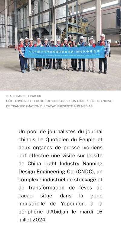 7月16日,人民日?qǐng)?bào)與兩家科特迪瓦新聞機(jī)構(gòu)記者一行參觀了由中國(guó)輕工業(yè)南寧設(shè)計(jì)工程有限公司總承包的可可加工及可可豆倉(cāng)庫(kù)建設(shè)項(xiàng)目,該項(xiàng)目坐落在阿比讓郊區(qū)的約普貢工業(yè)區(qū)。該公司負(fù)責(zé)人指出,該項(xiàng)目綜合體計(jì)劃于2024年年底完工,包括一個(gè)可加工5萬(wàn)噸可可豆的工廠、可存儲(chǔ)14萬(wàn)噸可可豆的倉(cāng)庫(kù)以及培訓(xùn)中心、行政大樓等?!钥铺氐贤甙⒈茸尵W(wǎng)報(bào)道