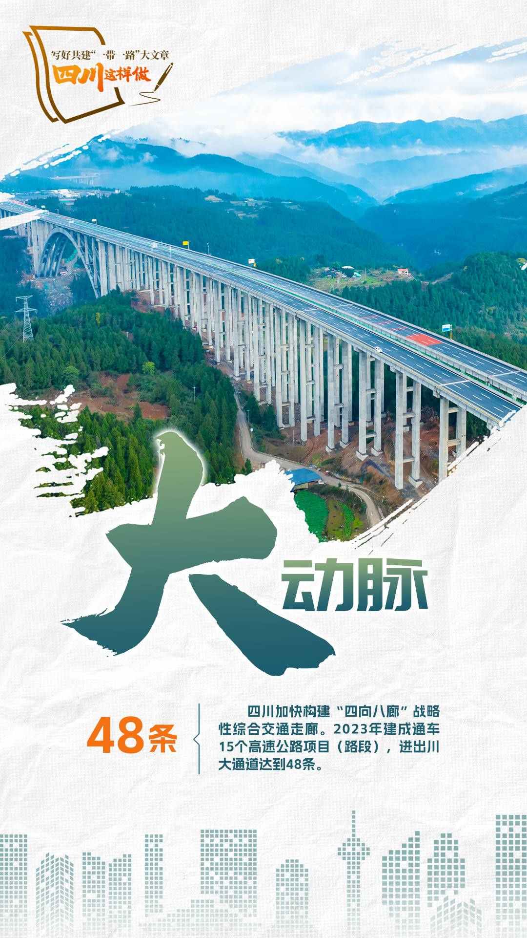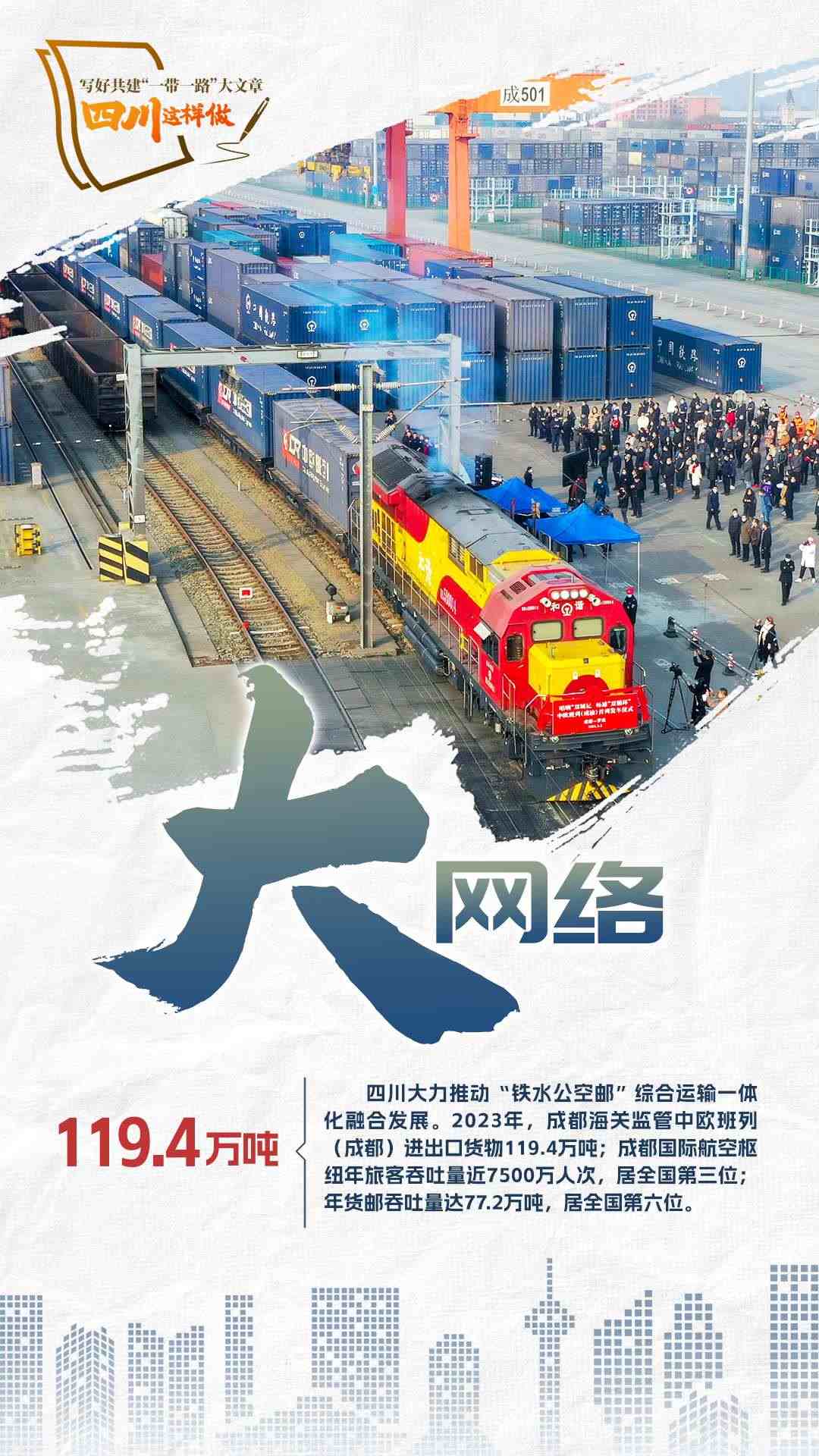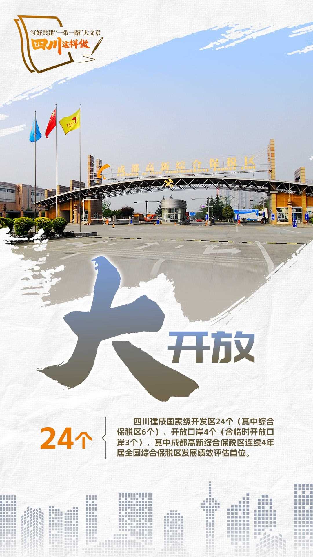 2023年,共建“一帶一路”走過第一個蓬勃十年,積極奔向更富活力的第二個“金色十年”。為推動共建“一帶一路”更高質(zhì)量、更高水平發(fā)展,宣布中國支持高質(zhì)量共建“一帶一路”的八項(xiàng)行動,包括構(gòu)建“一帶一路”立體互聯(lián)互通網(wǎng)絡(luò)、支持建設(shè)開放型世界經(jīng)濟(jì)、開展務(wù)實(shí)合作、促進(jìn)綠色發(fā)展、推動科技創(chuàng)新、支持民間交往、建設(shè)廉潔之路、完善“一帶一路”國際合作機(jī)制。2024年,我們將目光聚焦四川,作為內(nèi)陸開放的前沿陣地、西部大開發(fā)的戰(zhàn)略依托,看看第二個十年,四川如何寫好高質(zhì)量共建“一帶一路”大文章。