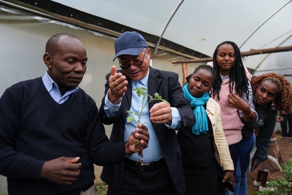 2023年9月18日,在肯尼亞納庫(kù)魯郡舉辦的中非農(nóng)業(yè)發(fā)展和減貧示范村番茄生產(chǎn)培訓(xùn)班上,來自中國(guó)的農(nóng)學(xué)教授劉高瓊(左二)為肯方學(xué)員指導(dǎo)農(nóng)業(yè)技術(shù)。多年來,中國(guó)農(nóng)業(yè)專家在當(dāng)?shù)亻_展了知識(shí)培訓(xùn)、技術(shù)指導(dǎo)和農(nóng)業(yè)設(shè)施修繕等工作,有效助力中國(guó)先進(jìn)的農(nóng)業(yè)技術(shù)在納庫(kù)魯?shù)貐^(qū)的示范推廣,幫助農(nóng)民實(shí)現(xiàn)增收減貧的目標(biāo)。