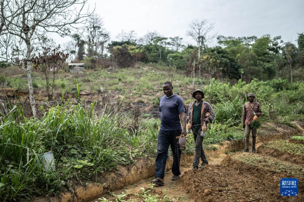 8月1日,農(nóng)民阿蘭(左)在剛果(布)國家一號公路沿線的菠蘿地內(nèi)采摘菠蘿。
