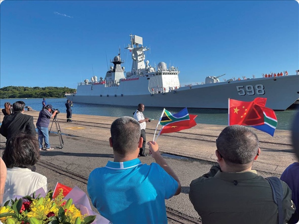 聯(lián)合演習(xí)開始前一天,中國(guó)海軍日照艦抵達(dá)南非理查茲灣港口,受到歡迎