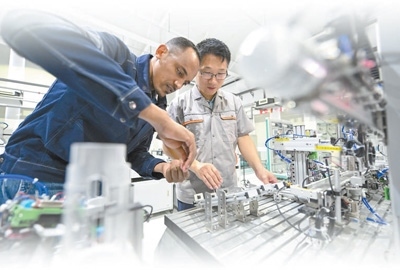 在第九屆非洲職業(yè)技能挑戰(zhàn)賽PLC賽區(qū),兩名裁判正在對選手的比賽結(jié)果進(jìn)行評分。本報(bào)記者 張博嵐攝