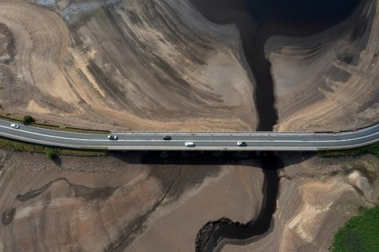 這是2022年7月19日在英國曼徹斯特附近拍攝的幾近干涸的伍德黑德水庫(無人機拍攝)。新華社發(fā)(喬恩·休珀攝)