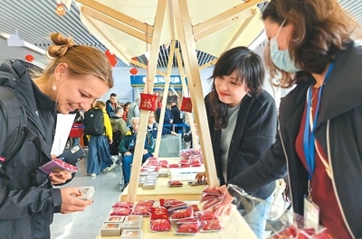 外國(guó)游客在“非遺彝繡秀北京”活動(dòng)期間體驗(yàn)佩戴彝繡工藝品。翁奇羽攝(人民視覺)