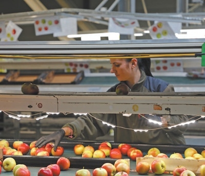 波蘭格魯耶茨縣一家蘋果加工企業(yè)內(nèi),當?shù)毓と苏诜謷O果。本報記者 禹麗敏攝
