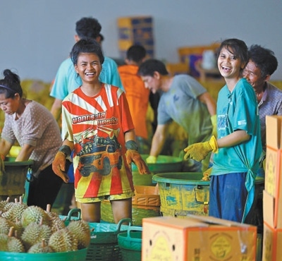 在位于泰國尖竹汶府的優(yōu)果東明水果廠,經(jīng)過分揀和清潔處理的榴蓮按品級分類整齊堆放、等待裝箱。本報記者 白元琪攝