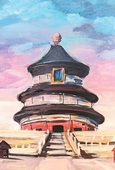 夕陽(yáng)余暉中,新西蘭華裔青少年們?cè)谔靿砟甑罴t墻邊席地而坐,揮動(dòng)畫筆,捕捉眼前美景?!跋﹃?yáng)下祈年殿更顯壯麗,我希望通過我的畫筆展現(xiàn)出它的雄偉?!眳⒃L團(tuán)學(xué)生秦曉寓說。