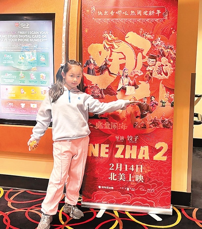 圖為唐夢(mèng)竹的女兒在美國(guó)洛杉磯一家影院的《哪吒之魔童鬧?!沸麄骱?bào)前留影。