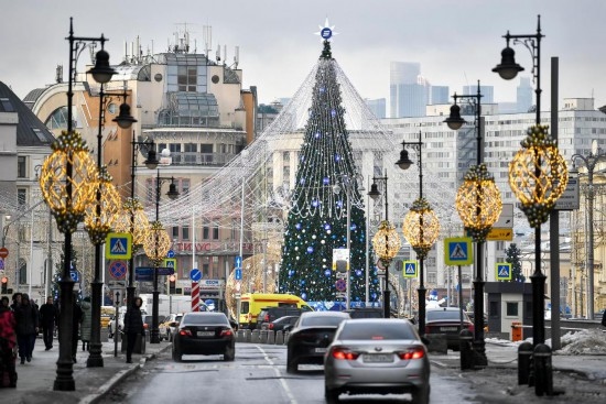 2023年12月22日,在俄羅斯首都莫斯科,車輛從新年樅樹附近駛過。新華社發(fā)(亞歷山大攝)