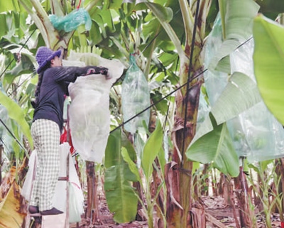 在柬埔寨磅湛省地澤香蕉園,蕉農(nóng)正給香蕉果實套袋。
