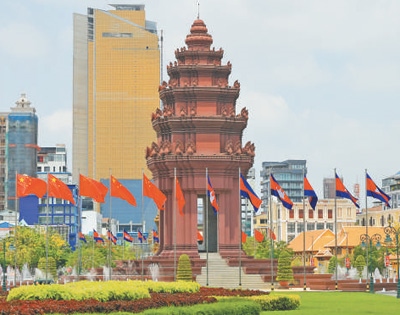 4月16日,在柬埔寨首都金邊市中心的獨立紀(jì)念碑前,中柬兩國國旗迎風(fēng)飄揚。