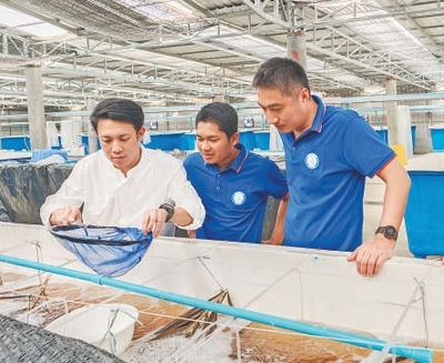 在柬埔寨干丹省一處羅氏沼蝦育苗場,上海海洋大學(xué)柬埔寨稻漁項目組成員指導(dǎo)當(dāng)?shù)毓ぷ魅藛T進行苗種培育。