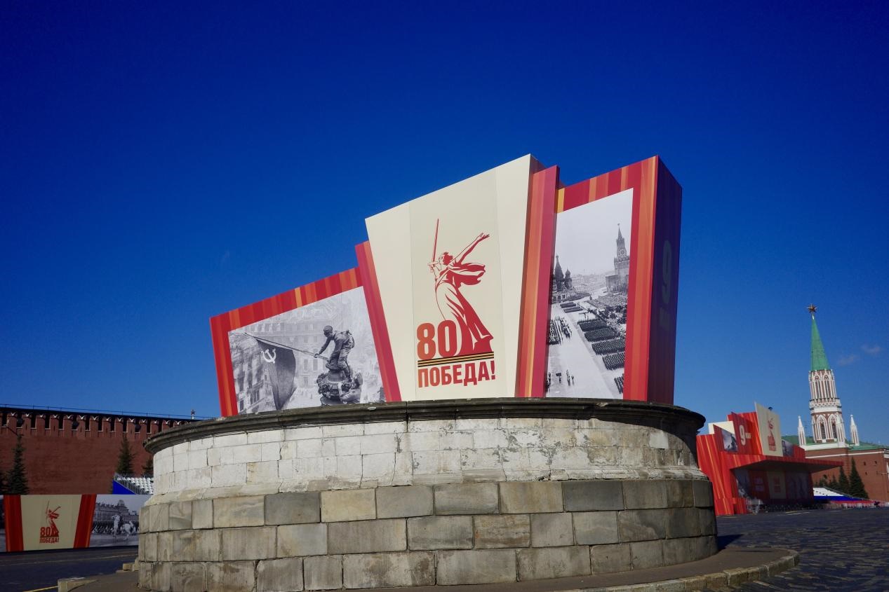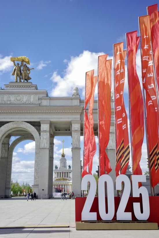 當?shù)貢r間5月6日,莫斯科威登漢(國民經(jīng)濟成就展覽館)大門前一側,布置好了2025標志和紀念旗幟。劉少華 攝