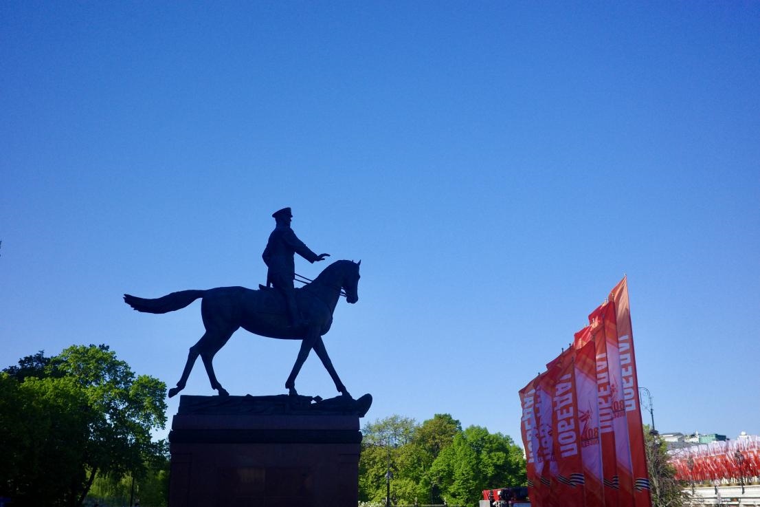 當?shù)貢r間5月6日,朱可夫元帥雕塑。這一形象原型來自1945年的勝利日閱兵,當時朱可夫騎馬行進在紅場。 劉少華 攝