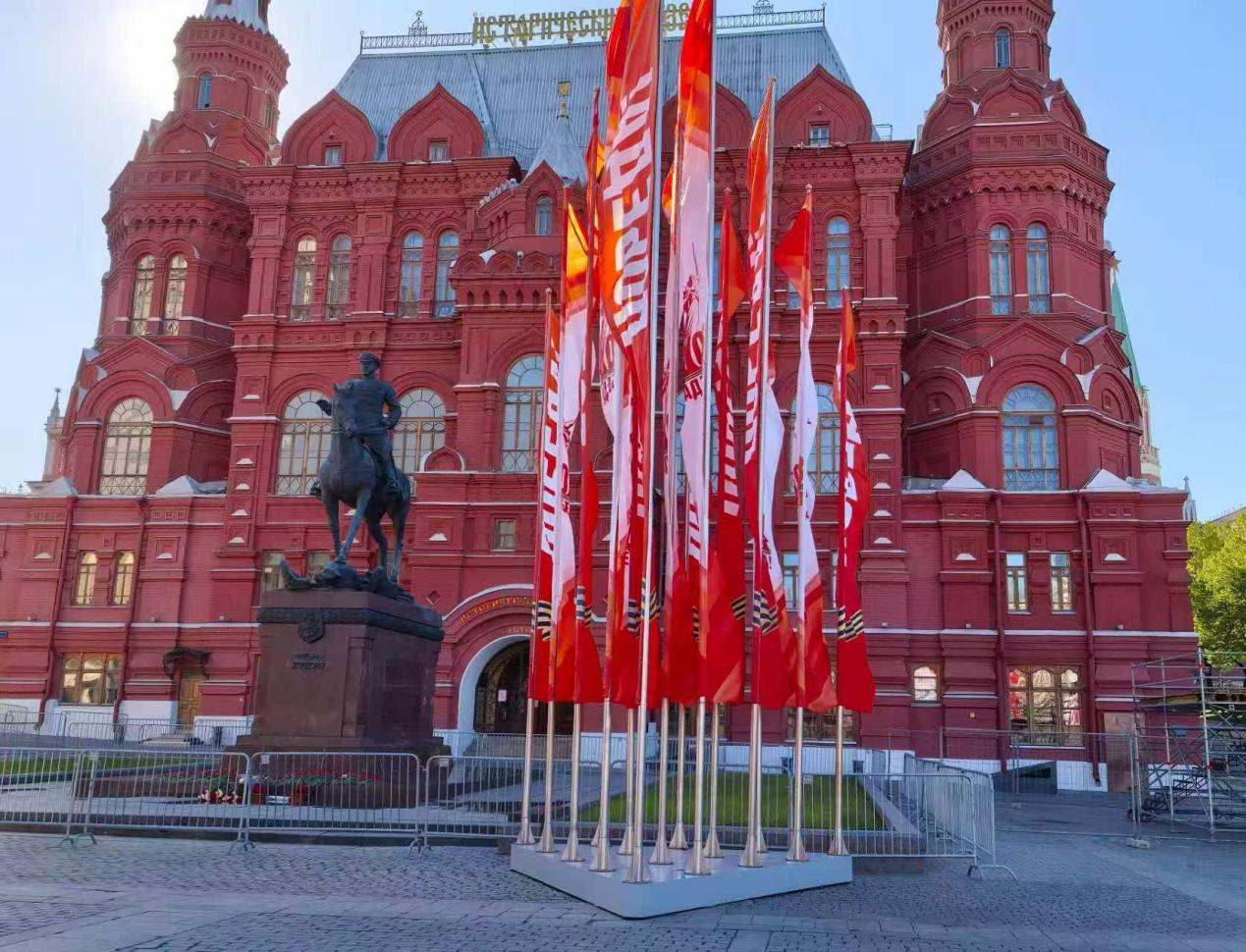 當?shù)貢r間5月6日,俄羅斯國家歷史博物館前擺放紀念蘇聯(lián)偉大衛(wèi)國戰(zhàn)爭勝利80周年慶典旗幟。 鄺西曦 攝