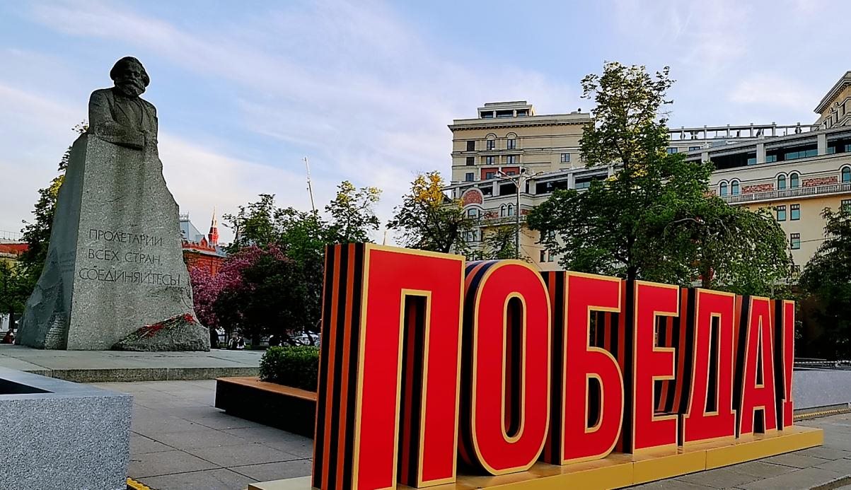 當?shù)貢r間5月6日,莫斯科大劇院對面,馬克思雕塑前的“勝利”字樣。鄺西曦 攝