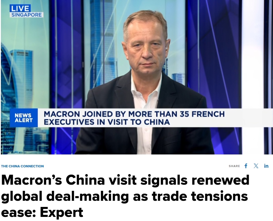 新加坡國立大學(xué)東亞研究所所長阿爾弗雷德?席睿德在接受采訪時認(rèn)為,馬克龍此次出訪不僅有望收獲重要的商業(yè)成果,更將在歐洲與中國之間長期存在的重要貿(mào)易問題上推動雙方在關(guān)鍵議題尋求突破。