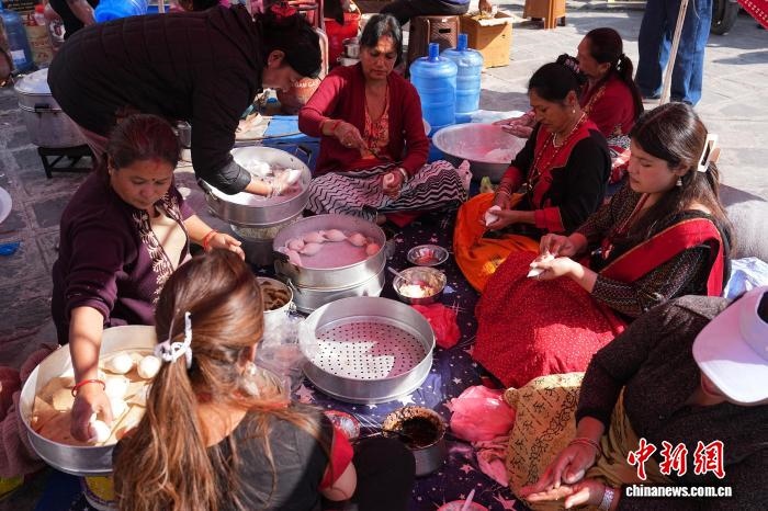 隊伍行進沿途隨處可見售賣尤麻瑞(Yomari)、蕎麥蛋餅(Bara)等尼瓦爾傳統(tǒng)食物的臨時攤位,熱氣與香味在空氣中彌漫。攤位前,排隊購買尤麻瑞的民眾絡繹不絕;攤位后,尼泊爾婦女忙著現場制作美食。