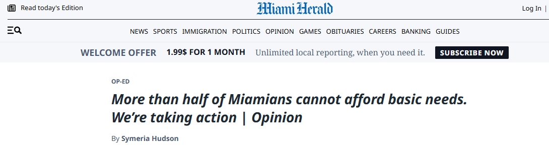 文章表示,在邁阿密,現(xiàn)實(shí)令人清醒:戴德縣超過五十萬個(gè)家庭難以負(fù)擔(dān)住房、食品、醫(yī)療、托兒、交通和技術(shù)等必需品和服務(wù)。家庭收入與實(shí)際生活成本之間的差距持續(xù)擴(kuò)大。西默里亞·哈德森在文中強(qiáng)調(diào),這些挑戰(zhàn)并非抽象概念。當(dāng)家庭被迫在支付房租和喂養(yǎng)孩子之間作出選擇時(shí),這并非個(gè)人失敗,而是系統(tǒng)性問題。這需要企業(yè)領(lǐng)導(dǎo)者、政策制定者、教育者、醫(yī)療系統(tǒng)、非營利組織和普通公民共同努力。