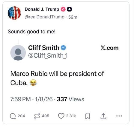 中新網(wǎng)1月12日電 據(jù)??怂剐侣劗?dāng)?shù)貢r(shí)間11日?qǐng)?bào)道,美國(guó)總統(tǒng)特朗普在社交平臺(tái)上回應(yīng)一則帖文,該貼文稱美國(guó)國(guó)務(wù)卿魯比奧“將成為古巴下一任領(lǐng)導(dǎo)人”。