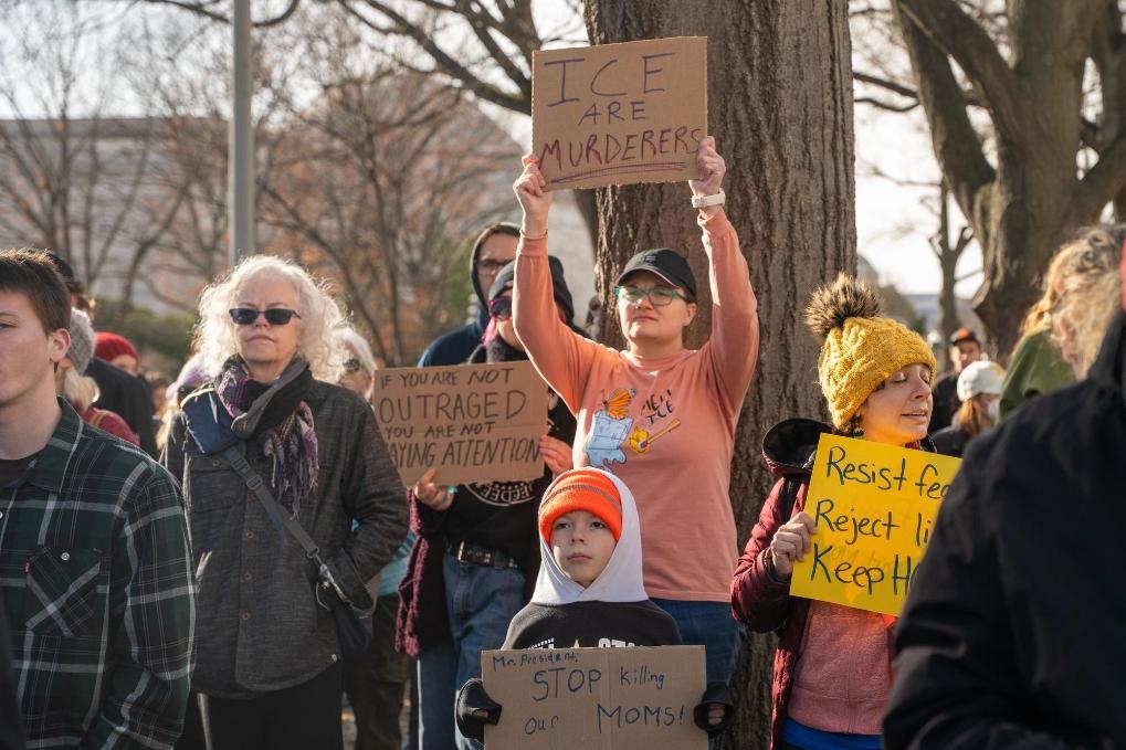 1月11日,在美國首都華盛頓,民眾抗議移民與海關(guān)執(zhí)法局暴力執(zhí)法。新華社發(fā)(李源清攝)