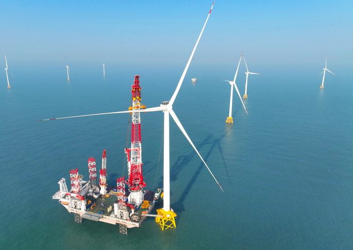 2026年1月13日在福建閩南海域拍攝的“大橋海風(fēng)”號(hào)2000噸自升式海上風(fēng)電安裝平臺(tái)和20兆瓦風(fēng)電機(jī)組吊裝現(xiàn)場(chǎng)(無人機(jī)照片)。新華社記者 林善傳 攝