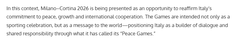 報道稱,2026年米蘭-科爾蒂納冬奧會被視為意大利重申對和平、發(fā)展及國際合作堅定承諾的重要契機。本屆冬奧會不僅將是一場精彩紛呈的體育盛會,更將向世界傳遞明確而有力的信息——通過這場“和平運動會”,意大利積極推動對話,為促進全球和平與發(fā)展貢獻力量。